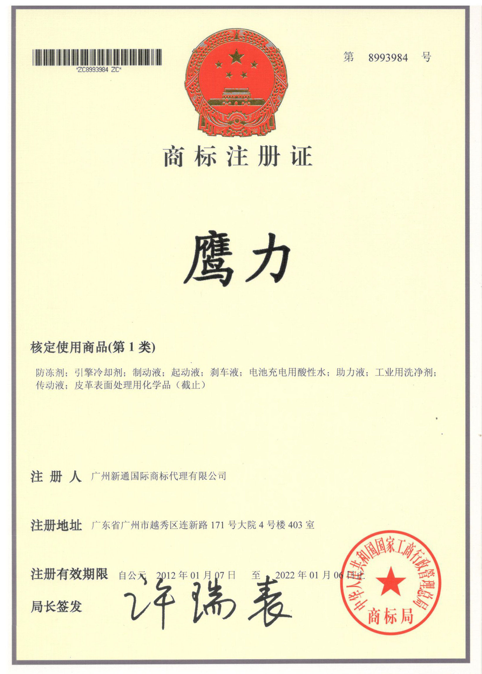 鷹力商標注冊證2